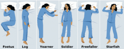 Starfish position - sleepers who lie on their backs with arms up near their head or the pillow account for 5% of participants. These people are good listeners, helpful, and are uncomfortable being the center of attention. People who sleep in starfish position are more likely to snore and to suffer from a poor night's sleep more often.