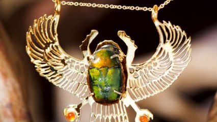 The scarab beetle has a famous habit of rolling balls of dung into small holes in the ground, laying its eggs inside the balls so that the larvae could use them for food. When the dung was consumed and the young beetles came out the Egyptians considered it a "spontaneous creation" thus worshipping this beetle as the god "Khepera", meaning "The one who came forth" – the creator god Atum. In ancient Egypt they used to use amulets containing the beetle, placing them on the chests of mommies, close to the heart.