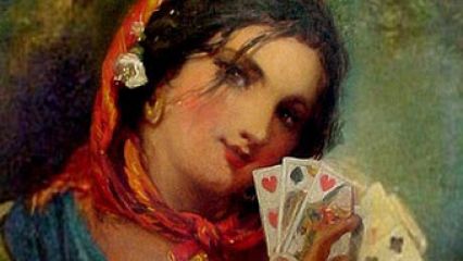 These unusual Russian Gypsy Fortunetelling cards are like a puzzle. Each card has four quarter-images, which match up with the other cards to make a huge picture.